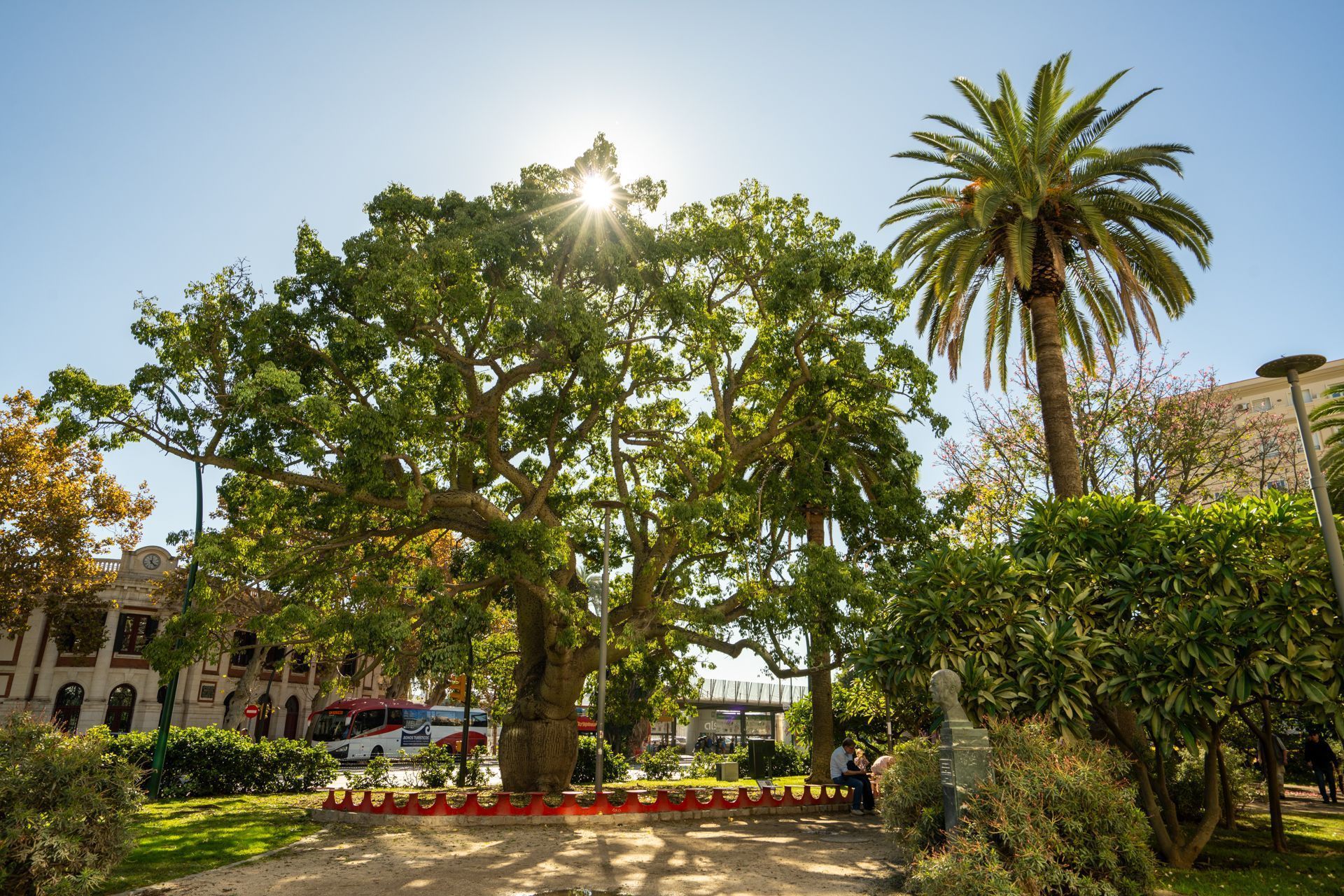 • un banco circular protector alrededor del "palo borracho"